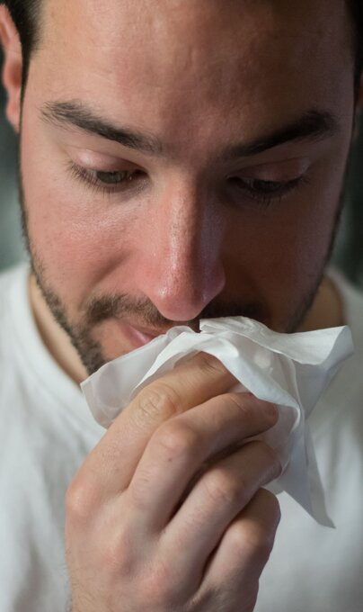 Bei Nasenbluten aufrecht sitzen und den Kopf nach vorne neigen. Ein Tuch vor die Nase halten, durch den offenen Mund atmen und die Nasenlöcher mit Daumen und Zeigefinger verschliessen. Dabei einen kalten, feuchten Waschlappen für gut fünf Minuten in den Nacken legen. Durch die Kälte ziehen sich reflektorisch auch die kleinen Blutgefässe in der Nase zusammen und die Blutung stoppt.
